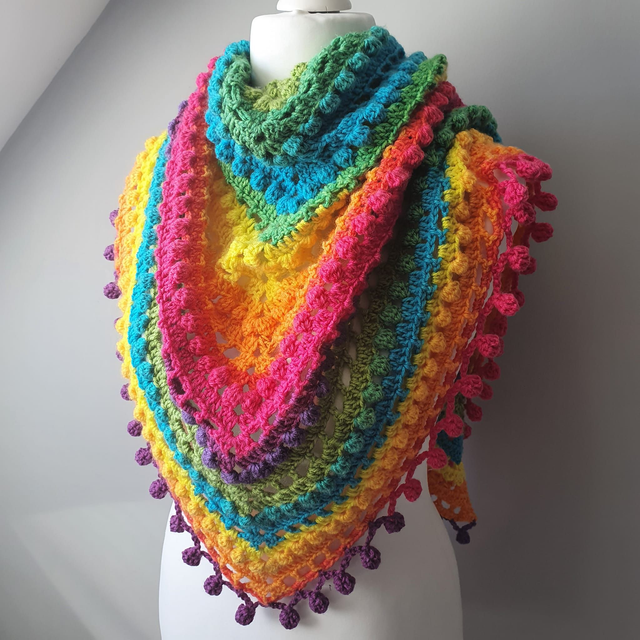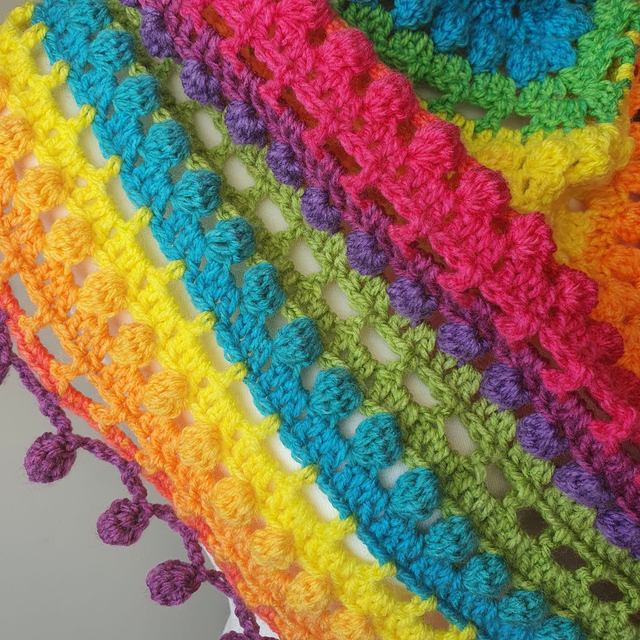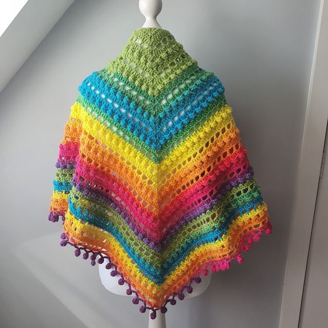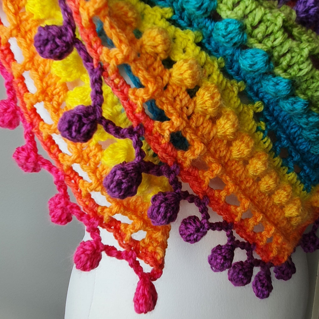 Bright, warm and super funky, this textured rainbow shawl is anything but frumpy.